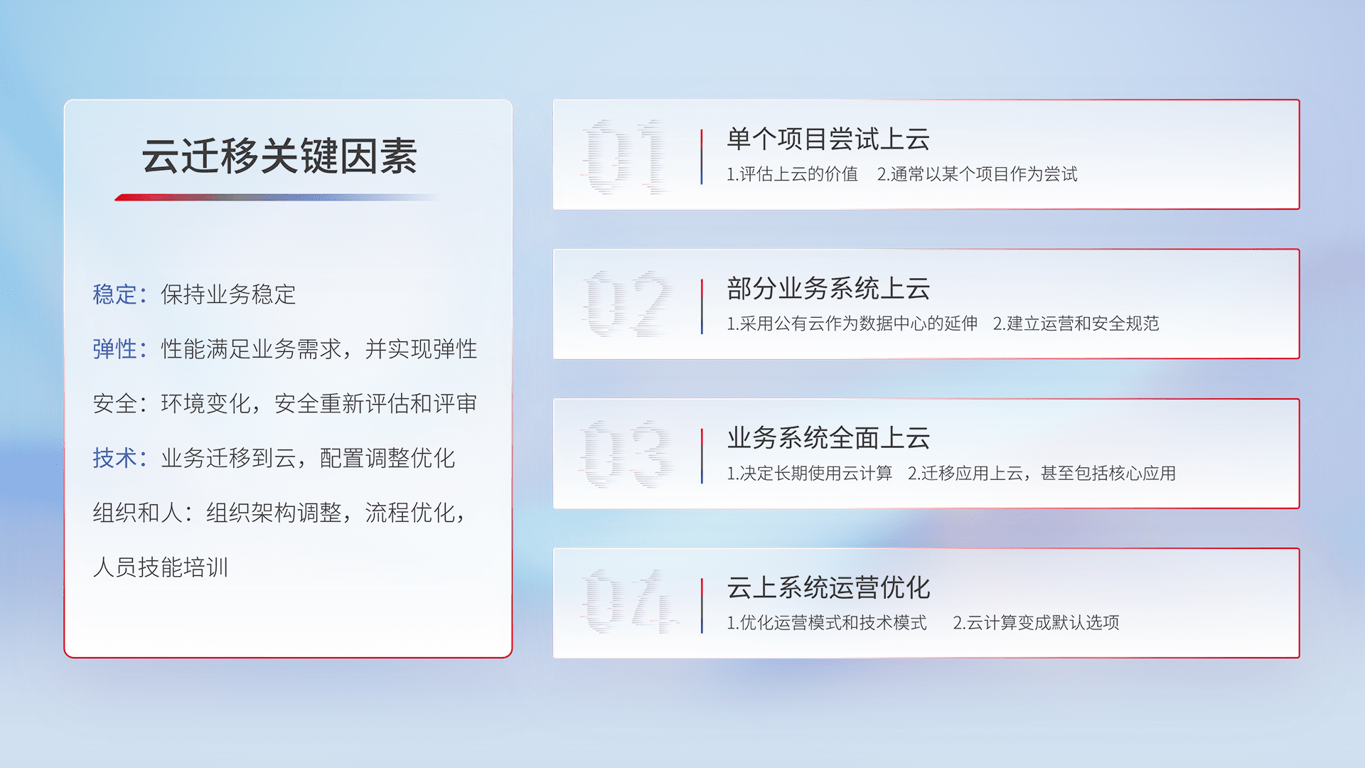 结合实际业务,,,从规划设计、、、、云平台选型、、云原生改造、、、、数据迁移、、集成交付,,,迁移全过程为客户识别最佳上云路径,,做好风险识别管理,,,,设计网络架构、、、、身份权限、、、、安全审计合规、、、操作审计、、、、日志审计、、监控告警策略、、、多站点容灾设计等,,,对云上基础设施进行整体规划,,,,提升IT治理水平,,以满足弹性、、、、高可用、、高性能的需求。。。。