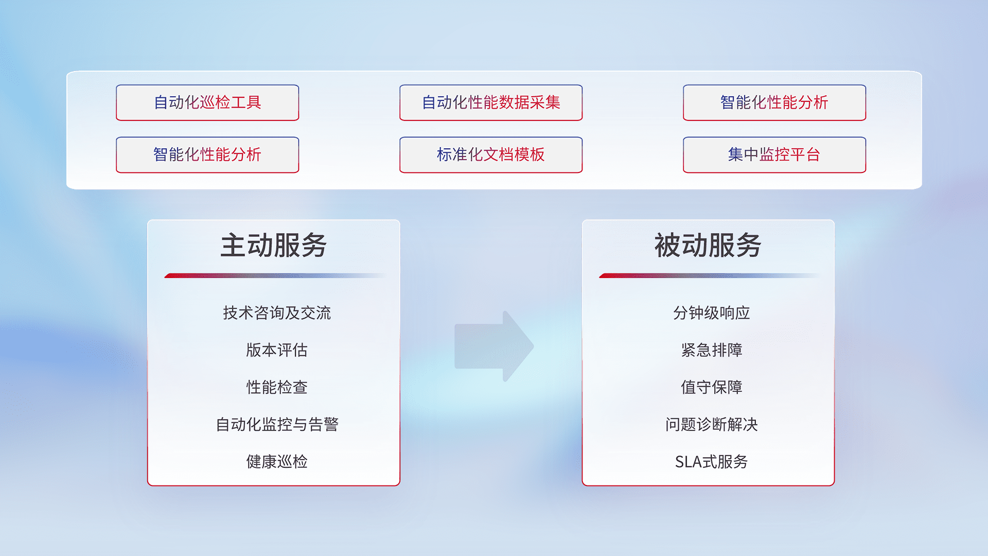智能化工具和标准化文档,,,,保障服务质量,,,,提供主动服务(包含技术咨询、、、版本评估、、性能检查、、、、自动化监控与告警、、、健康巡检)和被动服务包含(分钟级响应、、、、紧急排障、、、、值守保障、、问题诊断解决、、SLA服务)。。